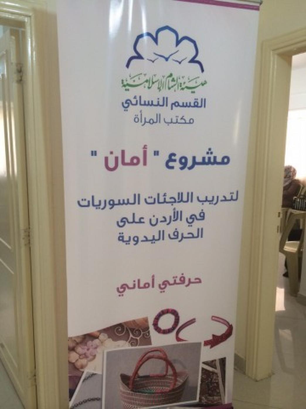 انطلاقاً من حرص هيئة الشام الإسلامية على تنمية مهارة النساء السوريات ومساعدتهن في الاعتماد على أنفسهن؛ فقد أطلق مكتب المرأة بالقسم النسائي بالهيئة الدورة الرابعة من مشروع "أمان" في عمان الأردن. وهو مشروع تنموي يقوم على تعليم المرأة بعض الصناعات أو الحرف اليدوية لمساعدتها مادياً، وتدريبها على استثمار وقتها وجهدها بما يفيدها، مما يولد لديها شعوراً بأهميتها وتقدير ذاتها.