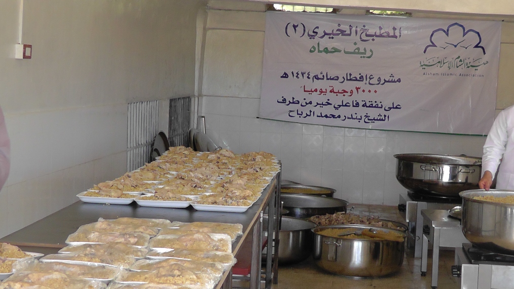 أما في أرياف حماة وريف إدلب الجنوبي، فضمن المشروع نفسه تم إنفاق باقي المبلغ وقدره 235.034 دولاراً أمريكياً على إنشاء ثلاثة مطابخ تابعة لهيئة الشام الإسلامية، وتم توزيعها جغرافياً بحيث تخدم أكبر عدد من البلدات والقرى في ريف حماة الشمالي وريفها الغربي، وريف إدلب الجنوب، واستفاد منها –بفضل الله تعالى- حوالي 100 بلدة وقرية. وبلغت الطاقة الإنتاجية للمطبخ الواحد خلال شهر رمضان المبارك حوالي 3000 وجبة فردية يومياً، وتم توزيع هذه الوجبات على المحتاجين من النازحين والفقراء وأسر الشهداء والمفقودين.