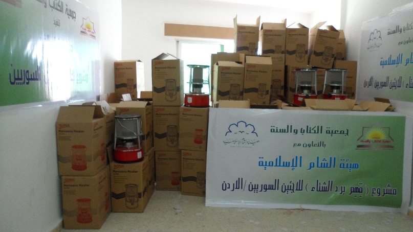 ضمن مشروع ( قهم برد الشتاء ) ، وبفضل الله تعالى وتوفيقه قام وفد من المكتب الإغاثي لهيئة الشام الإسلامية بالتعاون مع جمعية الكتاب والسنة في الأردن ، في شهر صفر عام 1433 هـ ، كانون الثاني / شباط 2012 م ، بشراء وتوزيع عدد من الدفايات الكهربائية على الأسر السورية النازحة إلى الأردن ، وقد تم بفضل الله تعالى تلبية احتياجات أكثر من 500 أسرة من مواد التدفئة لتخفيف معاناتهم مع البرد القارس هذه الأيام.